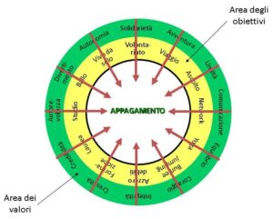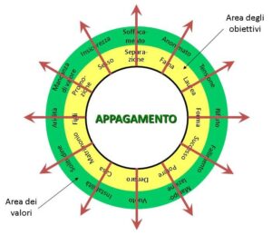 Nel cerchio esterno verde vedi tutta una seria di valori “negativi”, cioè stati emozionali che faremo di tutto per evitare di provare. Nel cerchio giallo si vedono invece gli obiettivi (sono solo esempi, naturalmente) che ti sei posto per raggiungere quei valori.