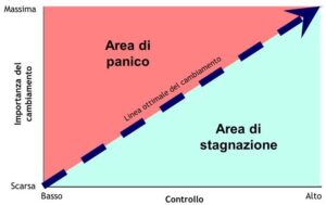 Posto che il modo migliore per mantenere il controllo su qualsiasi cambiamento è quello di creare/provocare quest’ultimo, anziché aspettare che si presenti per i fatti suoi, se si vuole avere il miglior rapporto tra cambiamento e crescita, cioè quanto controllo occorre avere su un cambiamento affinché favorisca una crescita, è necessario lavorare sulla diagonale centrale che separa le due aree (Panico e Stagnazione).