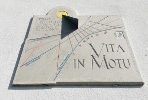 Il motto latino inciso sulla meridiana “Vita in Motu” significa che non c’è vita senza movimento e che quindi il movimento, il viaggiare perpetuo della Terra intorno al Sole con l’alternanza delle stagioni è sinonimo di vita.